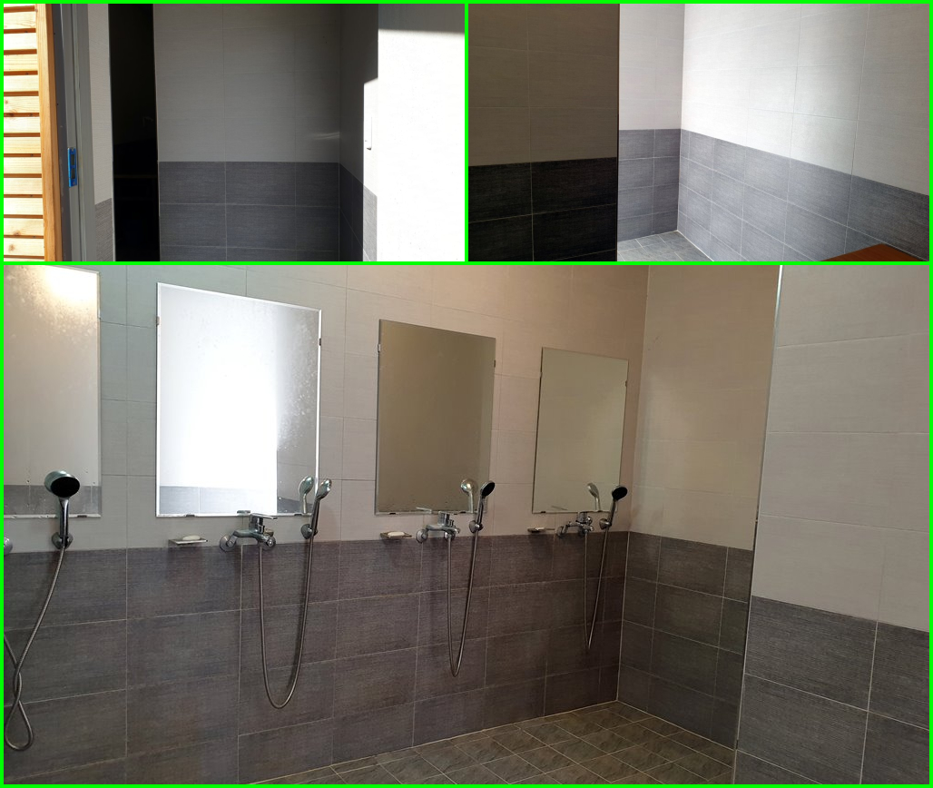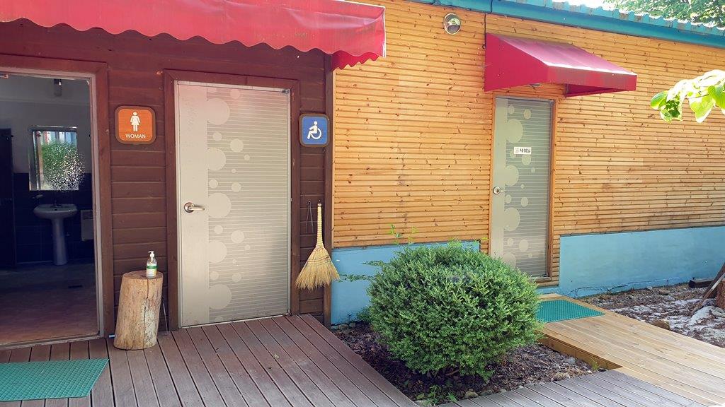잠깐 추가로 먼저, 주차를 하는 곳에서 건물을 보면 화장실과 샤워실이 보입니다. 이곳은 남성용 화장실과 샤워실이에요. 오른쪽이 화장실, 왼쪽이 샤워실~ 먼저 화장실 부터 내부를 보면