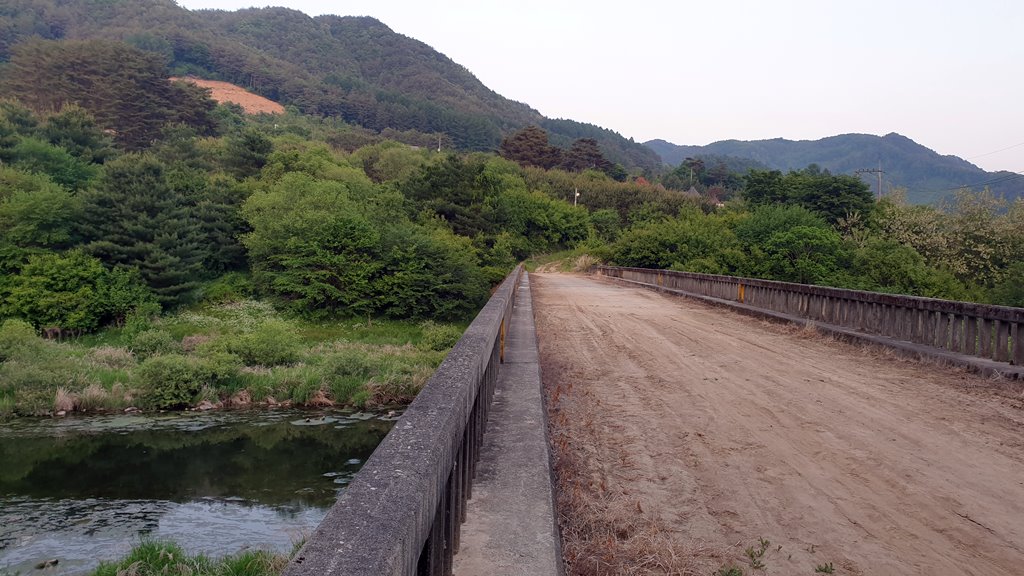 파란 화살표를 따라 가게 되면 도로는 차량 통행이 불가능하도록 막혀 있습니다. 걸어 갈 수는 있어요.그곳에 다리가 있으며, 냇가가 있는데, 멋있습니다.