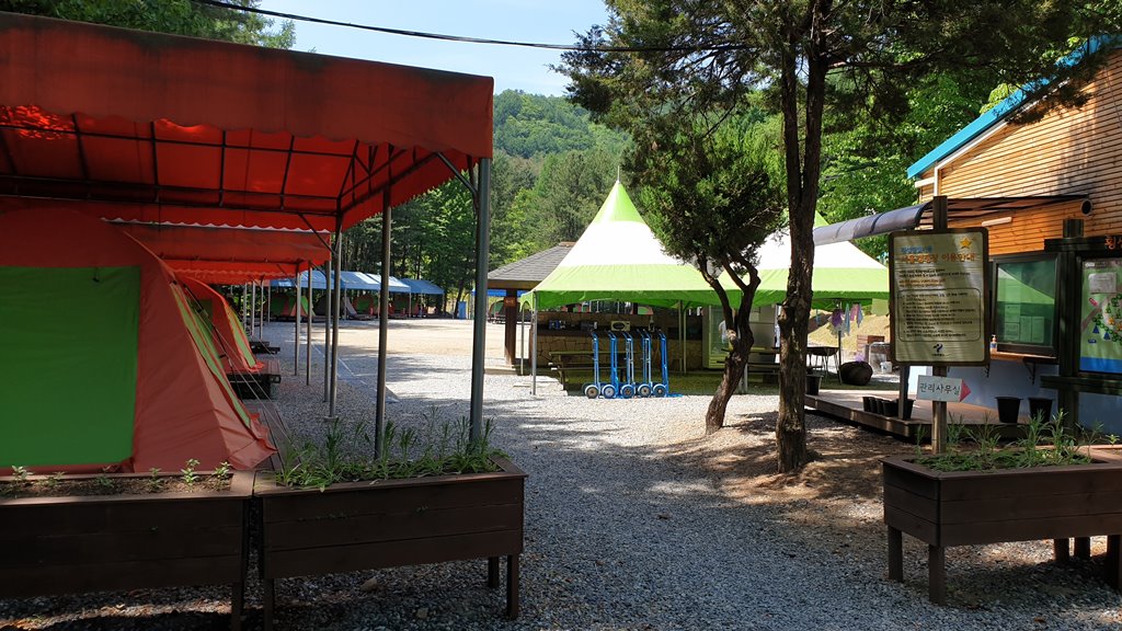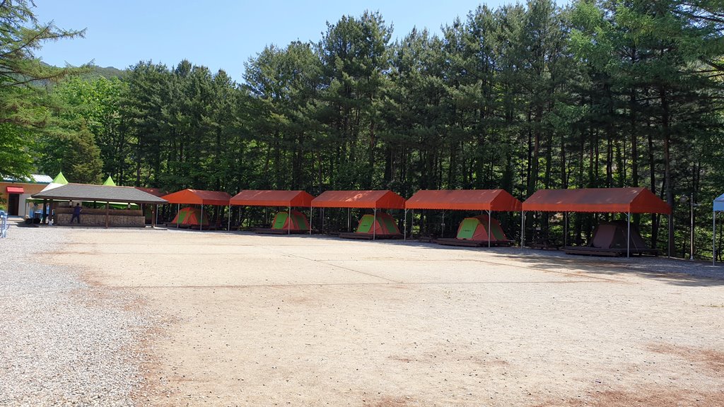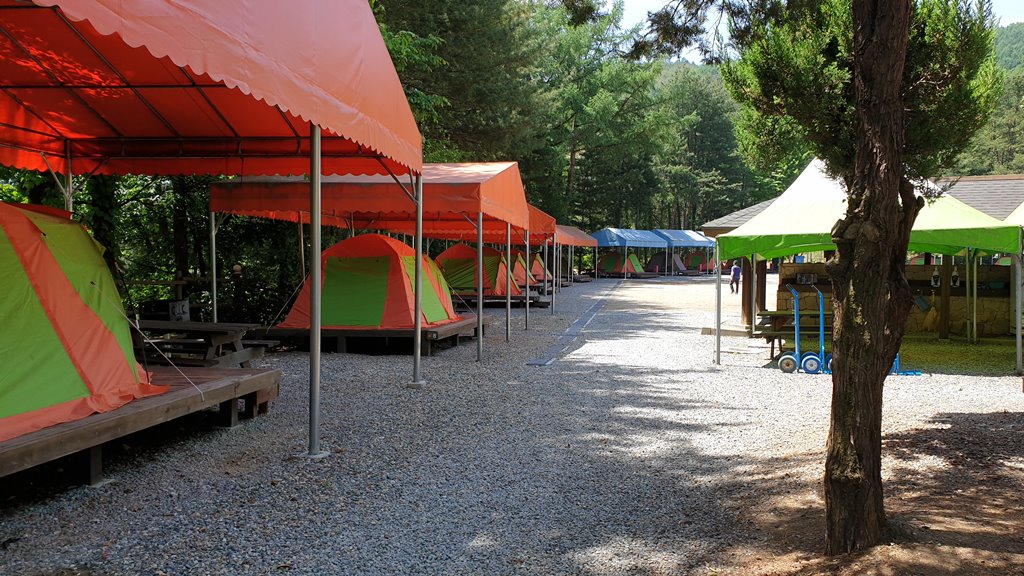 후문쪽에서 바라본 취사장쪽이에요. 보이는 사진 가장 오른쪽에 색이 다른 텐트가 있는 곳 옆으로 내려가는 길이 있어요. 그곳에 2개의 텐트가 설치되어 있습니다. 위 캠핑장 안내도를 보면 1번, 2번 텐트입니다.